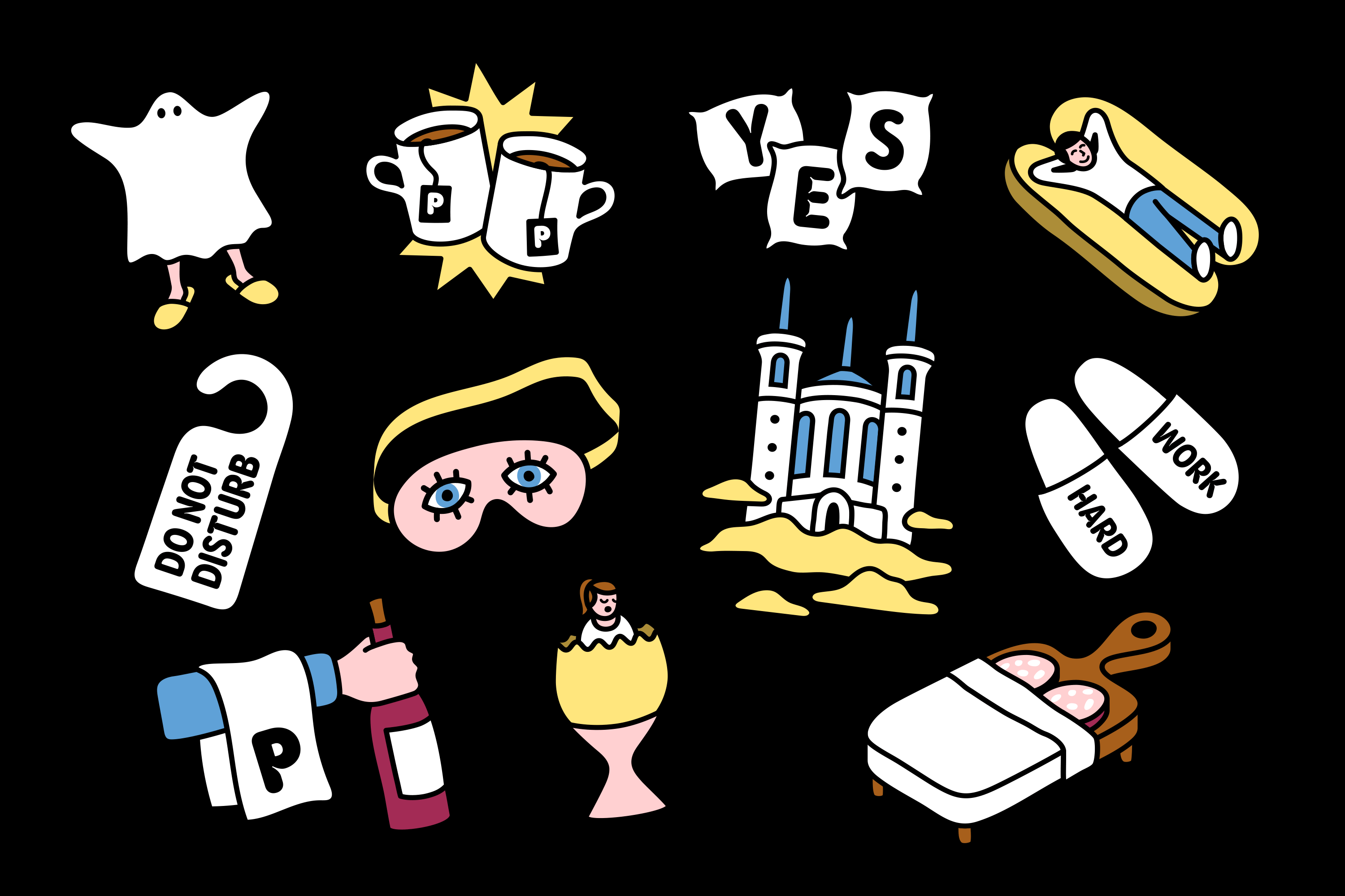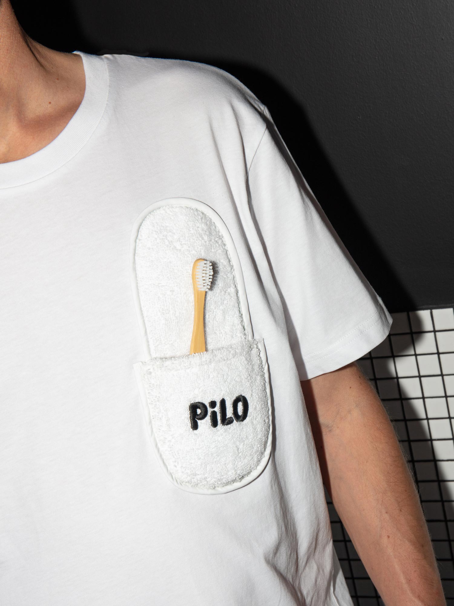 Dans l’univers de l’hôtellerie, tout ce qui pouvait être détourné l’a été ! On a dessiné une typographie qui reprend les plis des polochons, on a cousu un chausson su un tshirt, écrit des messages sur des draps, fait crame un fer à repasser, et on a réalisé des écussons brodés pour la signalétique du lieu !